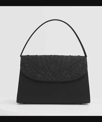 The embroidery on the bag is an original design by Iwasa, inspired by a feminine tiara, in order to create a design that exudes elegance even in formal settings. The gusseted handle that comes with the set also features a special cord embroidery design to be paired with the bag.