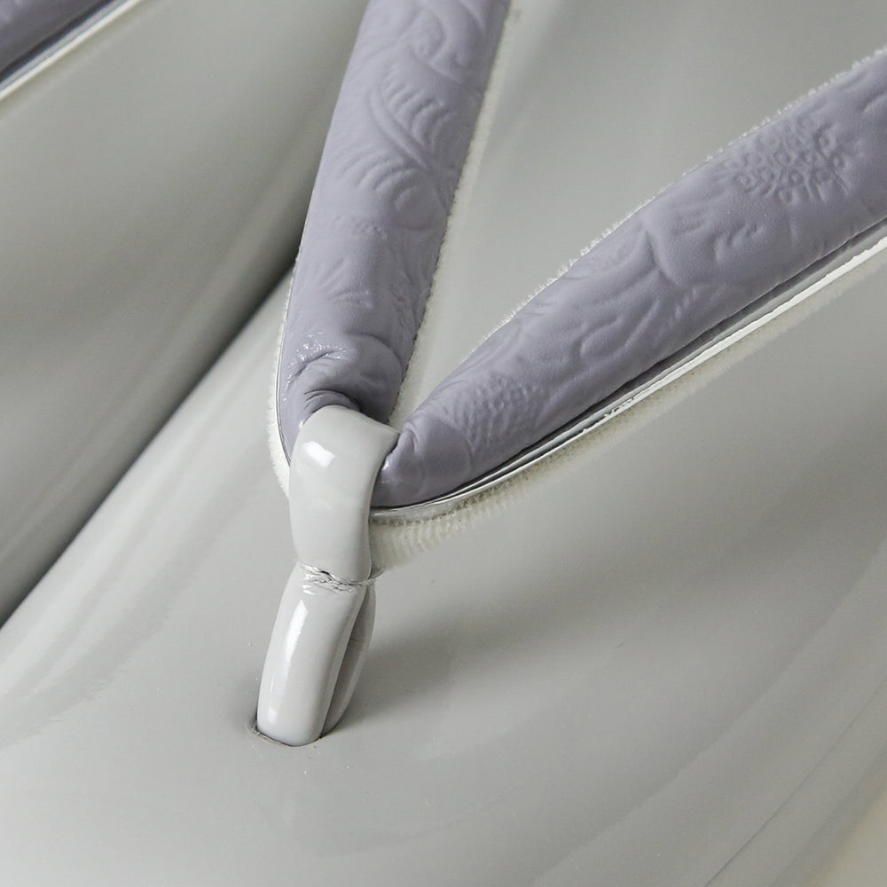 人気のスクエア型に、程よいツヤ感が魅力のエナメル素材で大人っぽい組み合わせ。鼻緒のサイドと台の隙間に、さりげなくキラッと光るシルバーラインがこだわりのポイントです。
